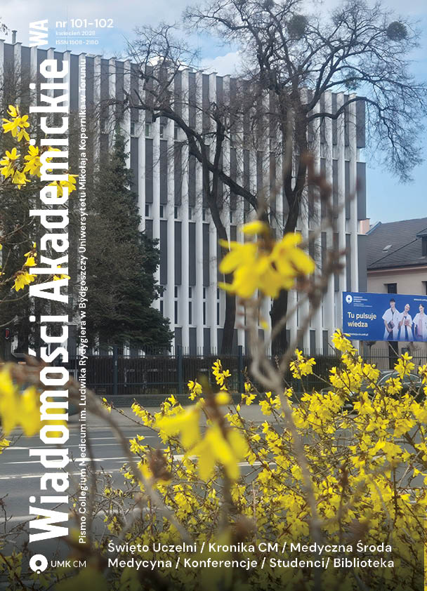 Zapraszamy do lektury najnowszego, wiosennego numeru „Wiadomości Akademickich”. w którym Czytelnicy znajdą m.in. wywiad „Medycyna jest piękną, ale zarazem bardzo wymagającą drogą – o studiach medycznych na niemieckiej uczelni, różnicach między kształceniem w Polsce i Niemczech, pracy naukowej oraz planach związanych z neurochirurgią opowiada bydgoszczanka Nina Drewa, studentka piątego roku medycyny Uniwersytetu w Heidelbergu”, relację z lutowego Święta Uczelni, mnóstwo wieści z Kroniki Collegium Medicum oraz medycznych sukcesów Uczelni, bardzo ciekawy i niestety aktualny artykuł o agresji wobec personelu medycznego jako zjawisku systemowym, różnorodne wykłady z Medycznej Środy (Demencja – „czasem zapominam” czy potrzebuję już pomocy?, Psychofizjologia oddechu – jak oddech wpływa na nasze myśli i nastrój, Między przymusem a wolnością – jak mózg uczy się uzależnienia oraz Psychologiczne aspekty hospitalizacji), a także wieści konferencyjne, sprawy studenckie i informacje z Biblioteki Medycznej. Okładkę kwietniowego numeru „Wiadomości Akademickich” zdobi zdjęcie autorstwa mgr inż. Justyny Gapskiej, które zdobyło I miejsce w konkursie fotograficznym „Wiosna w Collegium Medicum”.